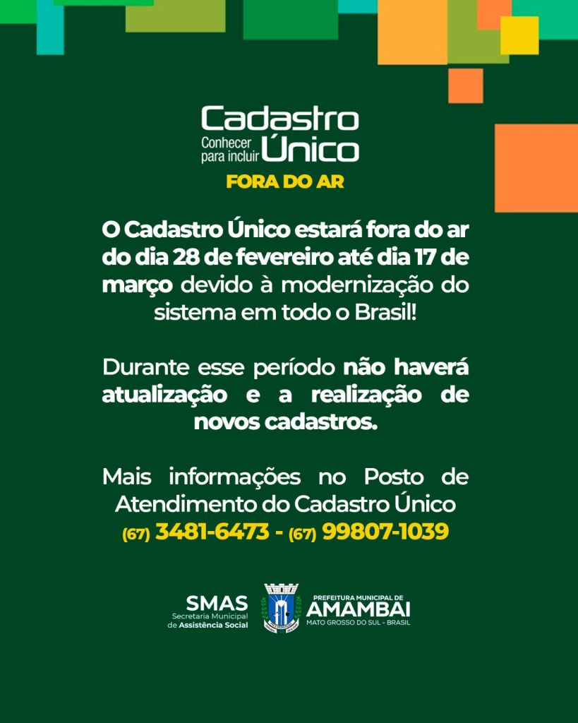 A Prefeitura de Amambai, por meio do Centro de Referência da Assistência Social (CRAS), informa que o sistema do Cadastro Único estará temporariamente fora do ar até o dia 17 de março de 2025.  De acordo com o informe número 61 de 17 de fevereiro de 2025, do Ministério do Desenvolvimento e Assistência social, Família e Combate a Fome - (MDS), a interrupção ocorre em nível nacional devido à implementação de uma nova plataforma, que promete modernizar e tornar mais eficientes os serviços.