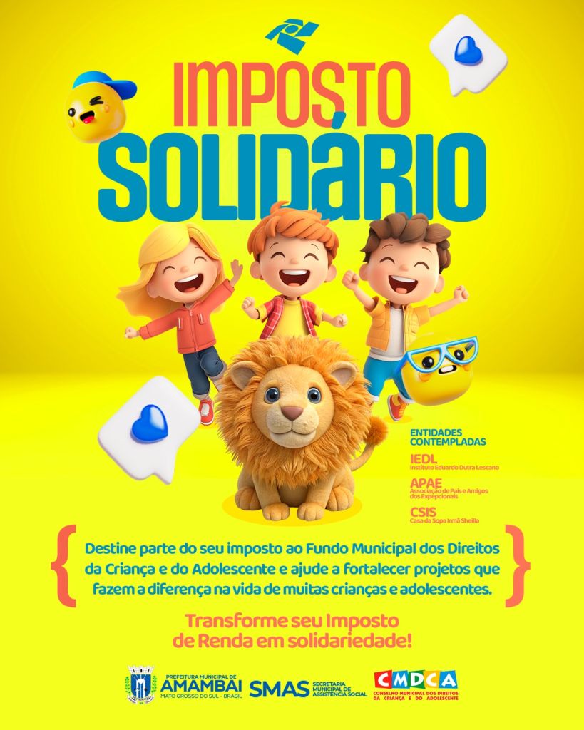 A Secretaria Municipal de Assistência Social, em parceria com o CMDCA (Conselho Municipal dos Direitos da Criança e do Adolescente), convida toda a comunidade amambaienses para se unir à Campanha Imposto de Renda Solidário, uma ação que visa transformar a realidade de muitas crianças e adolescentes em situação de vulnerabilidade social. A campanha conta com a colaboração de entidades reconhecidas como o Instituto Eduardo Dutra Lescano (IEDL), a Casa da Sopa Irmã Scheilla e a APAE, todas engajadas em promover ações transformadoras em nossa cidade.