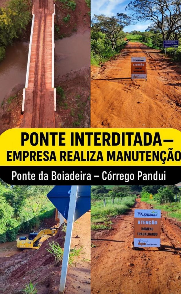 A Prefeitura de Amambai, por meio da Secretaria Municipal de Infraestrutura, informa à população que a ponte localizada na Estrada Boiadeira, sobre o Córrego Panduí, está temporariamente interditada para a realização de obras de manutenção.