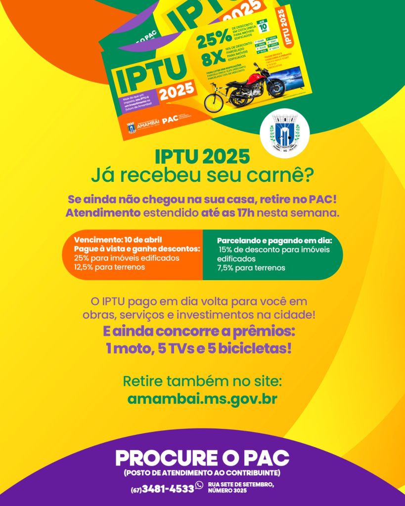 A Prefeitura de Amambai informa que os carnês do IPTU 2025 estão sendo entregues pelos Correios nas residências dos contribuintes com imóveis edificados. No entanto, caso você ainda não tenha recebido seu carnê, é possível retirá-lo diretamente no Posto de Atendimento ao Contribuinte (PAC).