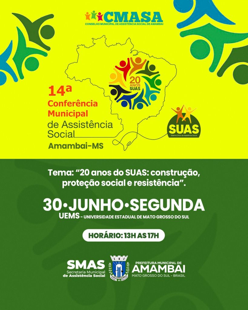 A Prefeitura de Amambai, por meio da Secretaria Municipal de Assistência Social (SMAS) e do Conselho Municipal de Assistência Social (CMASA), realiza nesta segunda-feira, 30 de junho, a 14ª Conferência Municipal de Assistência Social. O encontro acontecerá na UEMS – Universidade Estadual de Mato Grosso do Sul, das 13h às 17h, e é aberto a toda a população.