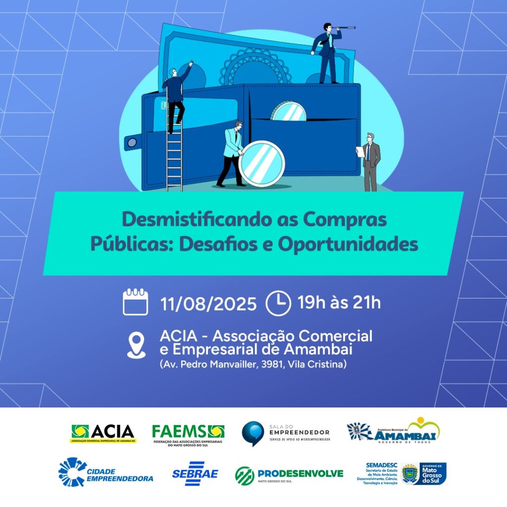 No dia 11 de agosto, empreendedores da cidade terão uma grande oportunidade de se capacitar para vender ao poder público. A partir das 19h, a sede da ACIA – Associação Comercial e Empresarial de Amambai, localizada na Av. Pedro Manvailer, 3981, Vila Cristina, será palco de dois workshops gratuitos voltados ao fortalecimento dos negócios locais por meio de compras públicas e licitações.
