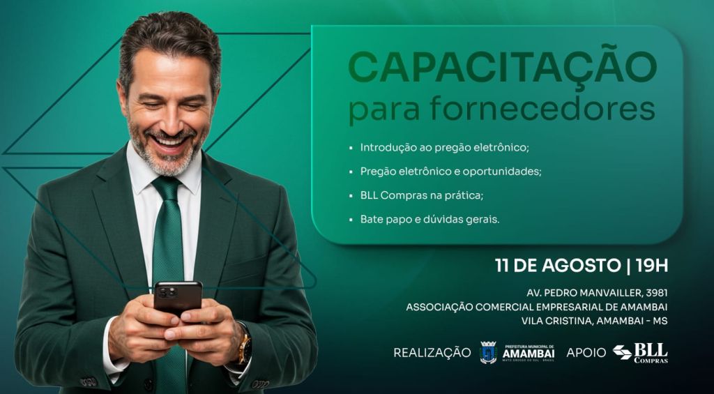 Na mesma noite, também será realizada a “Capacitação para Fornecedores”, com o objetivo de introduzir os participantes ao pregão eletrônico, apresentar oportunidades reais de participação por meio da plataforma BLL Compras, além de oferecer um espaço para bate-papo e esclarecimento de dúvidas. O evento é uma realização da Prefeitura Municipal de Amambai, com apoio da BLL.