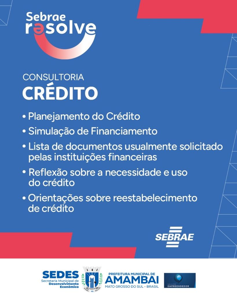 A Prefeitura de Amambai, por meio das Salas do Empreendedor Urbano e Rural, em parceria com o Sebrae, está promovendo uma rodada de consultorias presenciais com foco em crédito e planejamento financeiro. A iniciativa visa oferecer apoio técnico e orientação especializada para quem deseja tomar decisões mais conscientes sobre o uso de recursos financeiros no seu negócio.