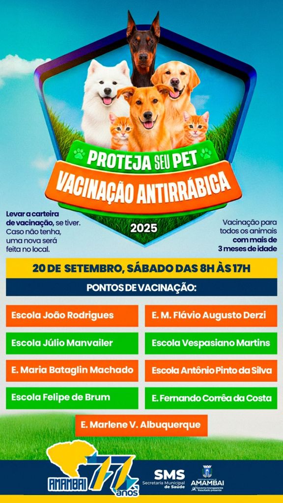 A Prefeitura de Amambai, por meio da Secretaria Municipal de Saúde (SMS), realiza no próximo dia 20 de setembro, sábado, o Dia D de Vacinação Antirrábica. A ação acontecerá das 8h às 17h, em diversos pontos da cidade, com o objetivo de garantir a saúde e proteção dos animais e também prevenir a raiva em humanos.