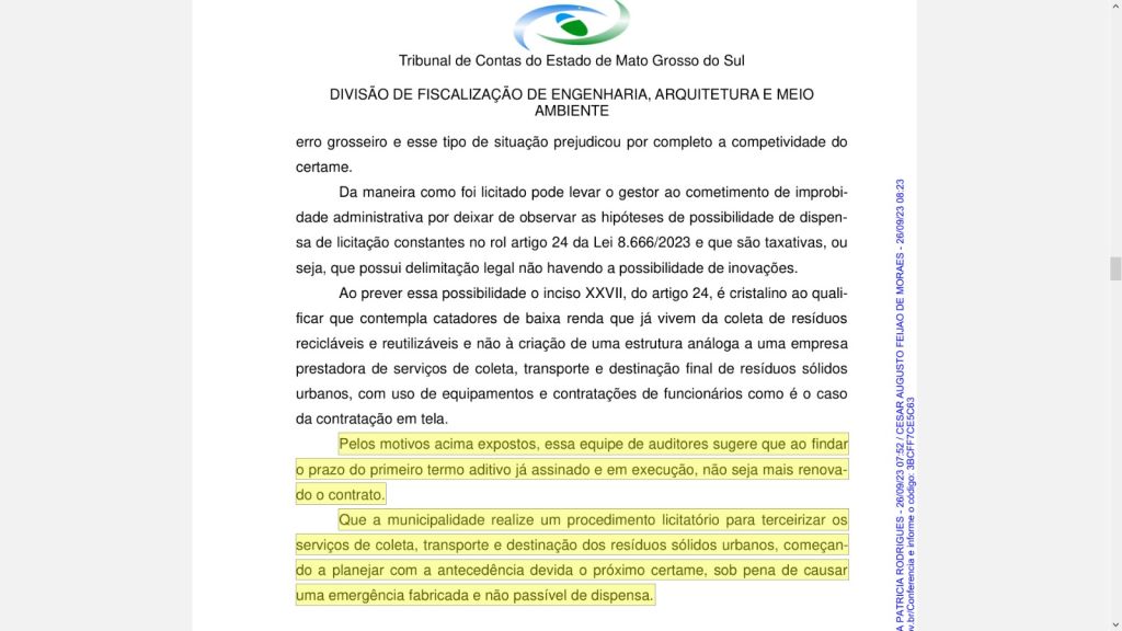 A decisão foi tomada em agosto de 2023, ainda durante a gestão municipal de 2021 a 2024, quando o TCE/MS concluiu, no processo nº 4542/2022, pela ilegalidade e irregularidade da dispensa de licitação e do contrato nº 2.666/2022. O órgão determinou que, ao final do prazo contratual, não houvesse renovação e que a Prefeitura realizasse uma nova licitação para assegurar legalidade e transparência.