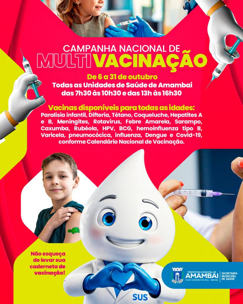 A Prefeitura de Amambai, por meio da Secretaria Municipal de Saúde, deu início à Campanha Nacional de Multivacinação 2025, que acontece de 6 a 31 de outubro em todas as Unidades de Saúde do município.