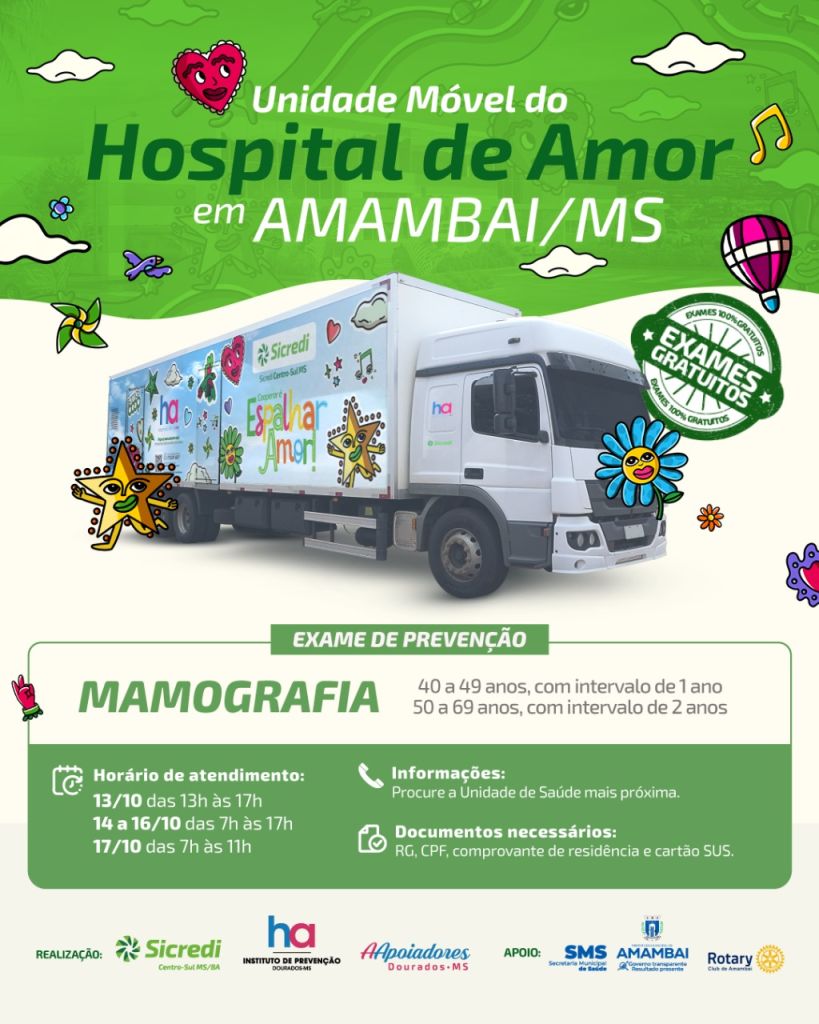 A ação é uma realização do Hospital de Amor, com apoio da Sicredi Centro-Sul MS/BA, Prefeitura de Amambai, por meio da Secretaria Municipal de Saúde, e do Rotary Club.