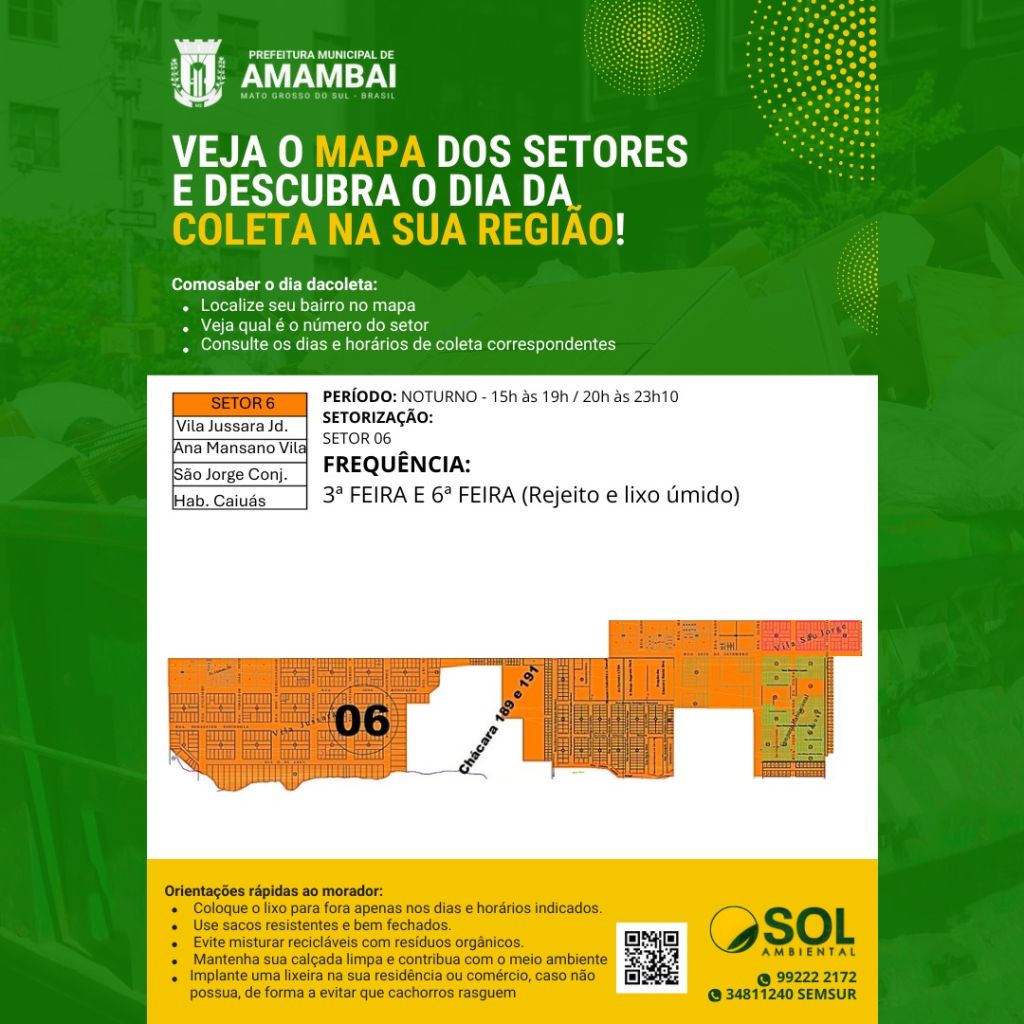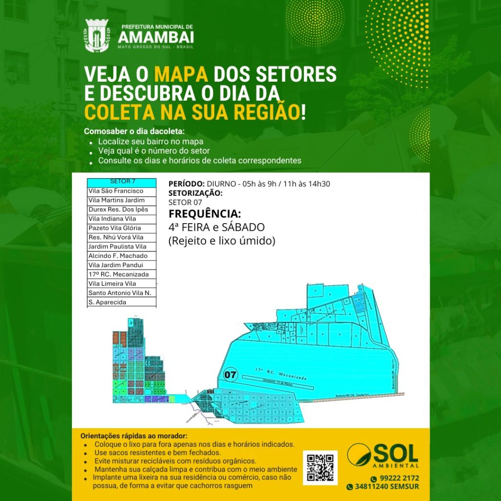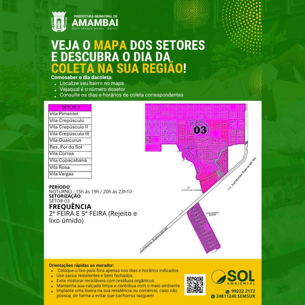 Importante: As informações sobre a coleta seletiva (recicláveis) serão publicadas em breve nos canais oficiais da Prefeitura de Amambai.