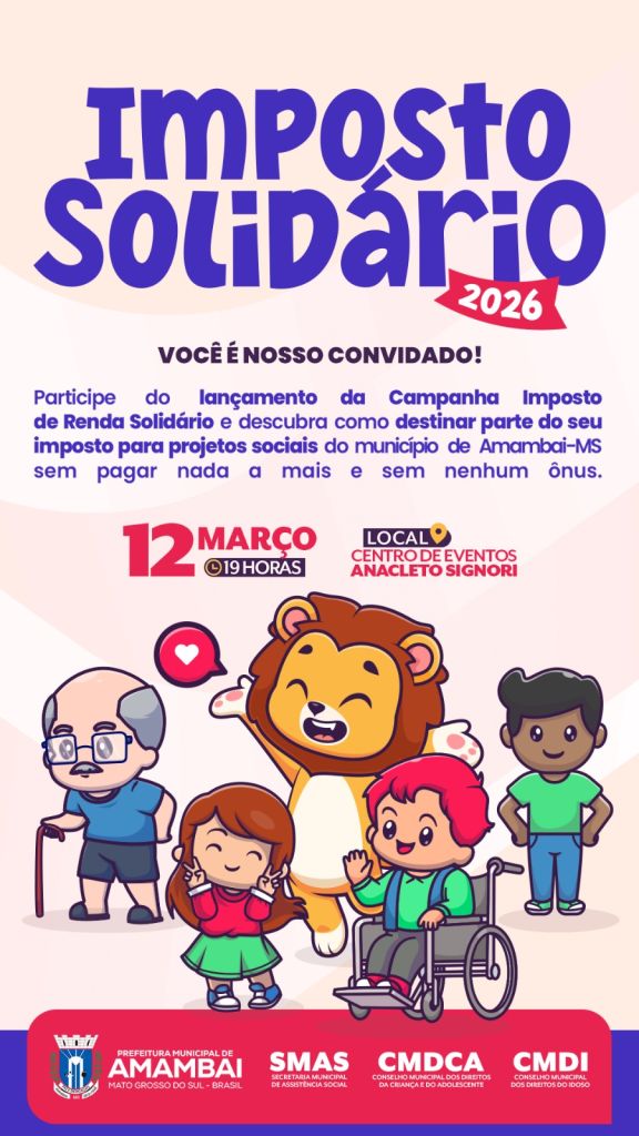 A Prefeitura de Amambai, por meio da Secretaria Municipal de Assistência Social (SMAS), em parceria com o Conselho Municipal dos Direitos da Criança e do Adolescente (CMDCA) e o Conselho Municipal dos Direitos da Pessoa Idosa (CMDI), realiza no dia 12 de março, às 19 horas, o lançamento da Campanha Imposto de Renda Solidário 2026.