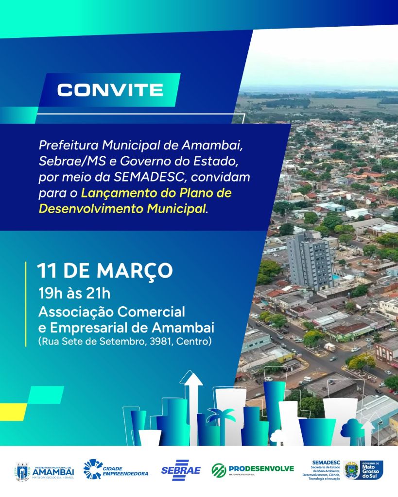 No dia 11 de março, das 19h às 21h, será lançado o Plano de Desenvolvimento Municipal (PDM) de Amambai. A iniciativa é realizada pelo Sebrae/MS, em parceria com o Governo do Estado, por meio da Secretaria de Estado de Meio Ambiente, Desenvolvimento, Ciência, Tecnologia e Inovação (Semadesc), e Prefeitura Municipal. O evento integra as ações do programa Cidade Empreendedora, desenvolvido no município em uma parceria entre as instituições, e será realizado na Associação Comercial e Empresarial de Amambai, localizada na rua Sete de Setembro, 3981, Centro.