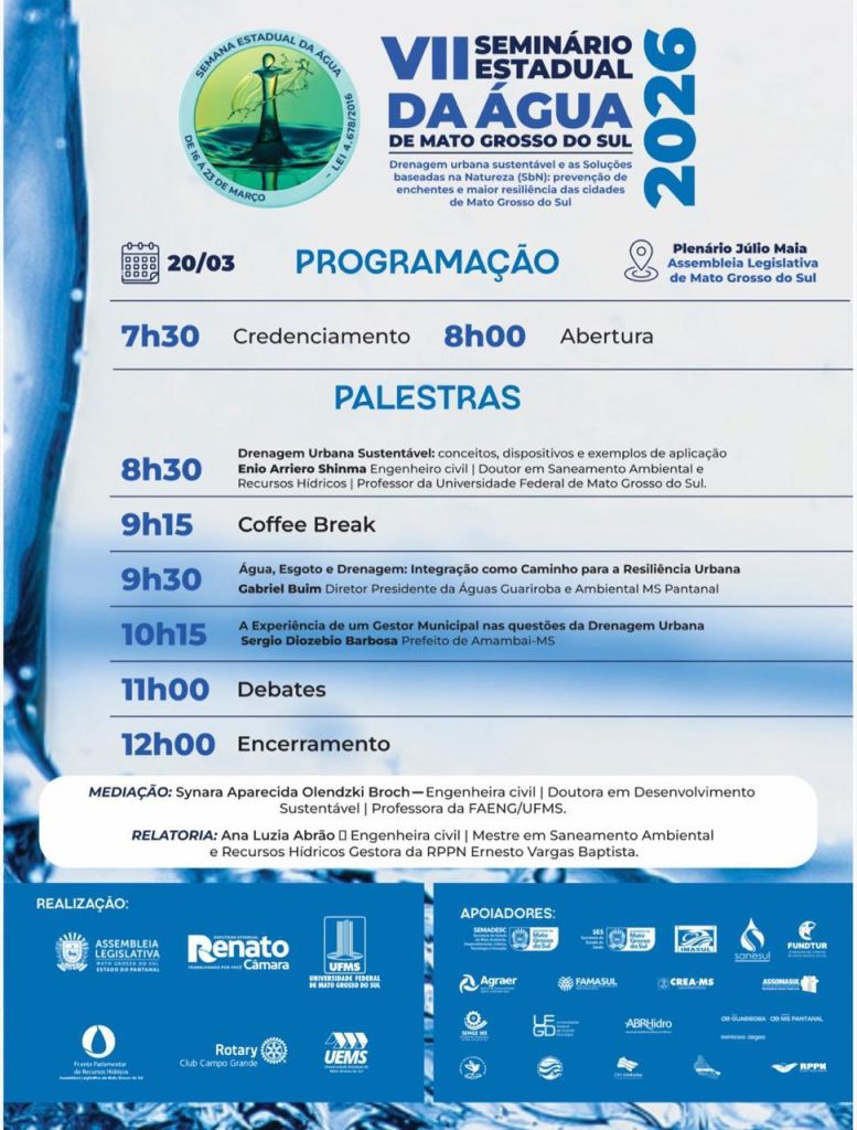 A programação acontece no plenário da Assembleia Legislativa de Mato Grosso do Sul e terá como foco principal a drenagem urbana sustentável e as soluções baseadas na natureza, com o objetivo de fortalecer a resiliência das cidades frente aos desafios ambientais.
