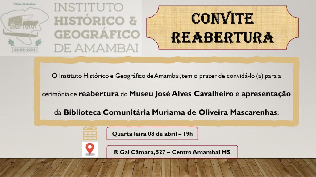 O Instituto Histórico e Geográfico de Amambai realiza, nesta quarta-feira (08), às 19h, a cerimônia de reabertura do Museu José Alves Cavalheiro, um importante espaço de preservação da memória e da cultura local.