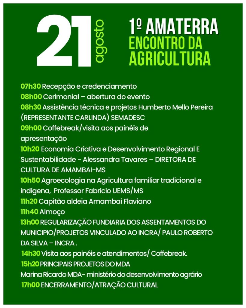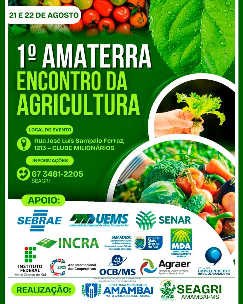 A Prefeitura de Amambai, por meio da Secretaria Municipal de Agricultura (Seagri) e em parceria com diversas entidades, realiza nesta sexta-feira e sábado, dias 21 e 22 de agosto, o 1º Amaterra – Encontro da Agricultura, no Clube Milionários. A iniciativa tem como objetivo fortalecer a agricultura familiar, tradicional e sustentável no município e região.