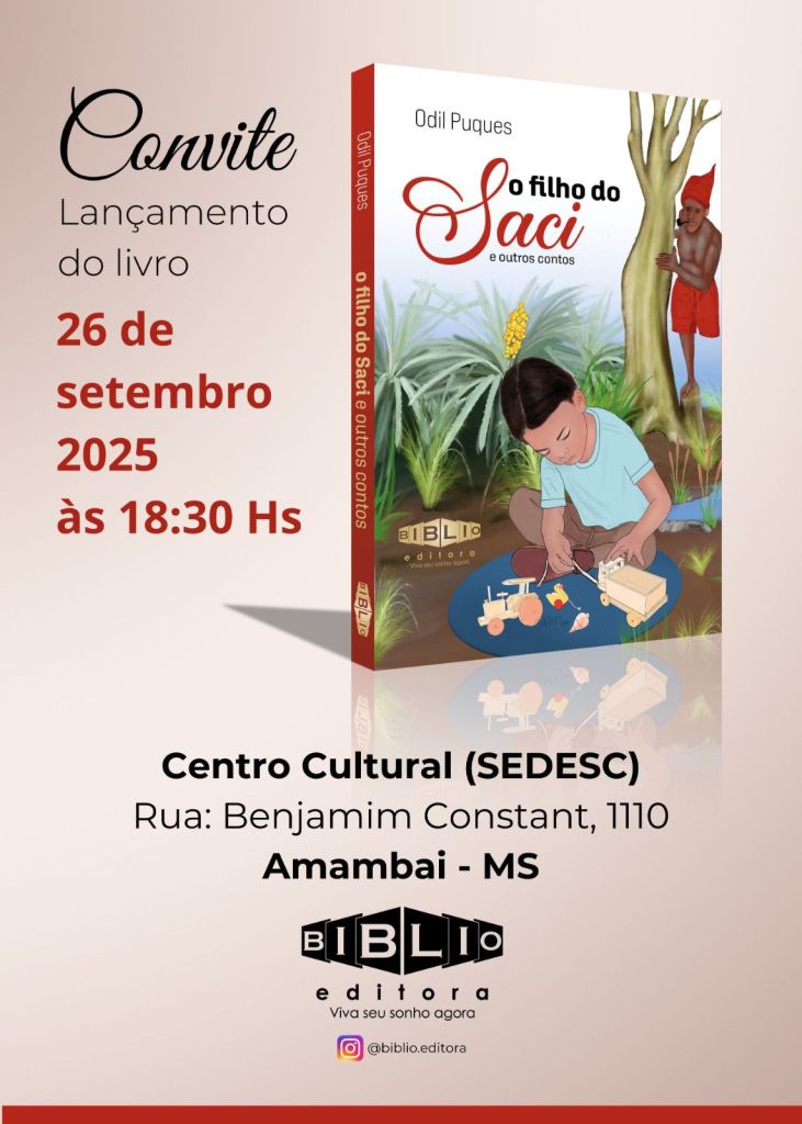 O escritor amambaiense Odil Puques lança, nesta sexta-feira (26 de setembro de 2025, às 18h30), seu novo livro O Filho do Saci e outros contos. O evento acontece no Centro Cultural (SEDESC) e faz parte da programação oficial em comemoração aos 77 anos de emancipação político-administrativa de Amambai, celebrados no dia 28 de setembro.