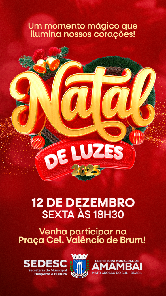 A magia do Natal vai tomar conta de Amambai nesta sexta-feira, 12 de dezembro, com a inauguração oficial do Natal de Luzes, a partir das 18h30, na Praça Coronel Valêncio de Brum. O evento é promovido pela Prefeitura de Amambai, por meio da Secretaria de Desporto e Cultura (SEDESC), e marca o início da programação natalina no município.