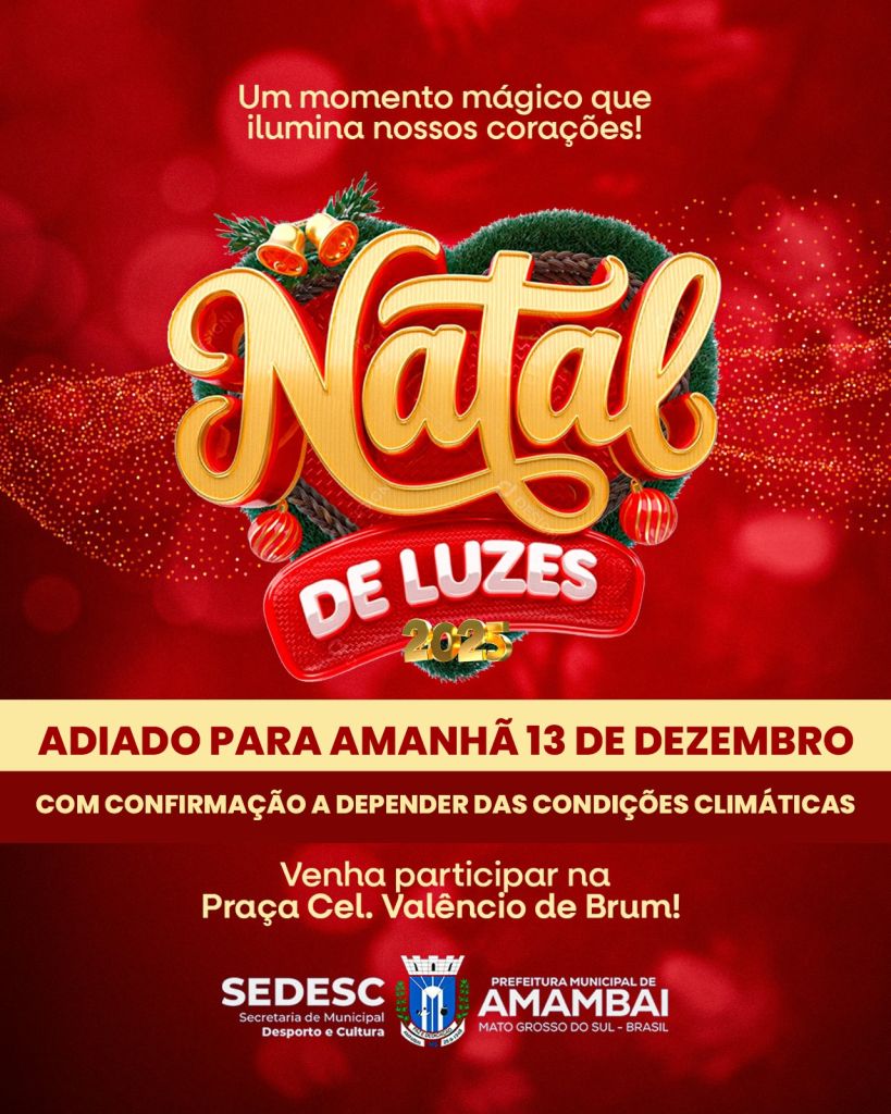 A Prefeitura de Amambai, por meio da Secretaria de Desporto e Cultura (SEDESC), informou na tarde desta sexta-feira (12) que a inauguração do Natal de Luzes, que aconteceria hoje na Praça Coronel Valêncio de Brum, foi adiada para sábado, dia 13 de dezembro, em razão das fortes chuvas que atingem o município desde o início da tarde.